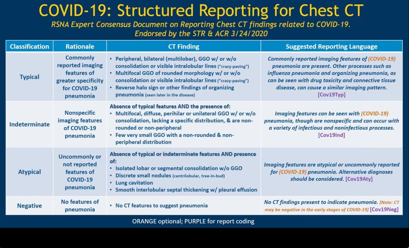 - RSNA Expert Panel Consensus Statement on Reporting Chest CT Findings Related to COVID-19, Endorsed by the Society of Thoracic Radiology, American College of Radiology and RSNA: