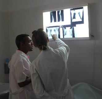 RAD-AID Volunteer reviews radiographs with a local physician in Mosteiros.